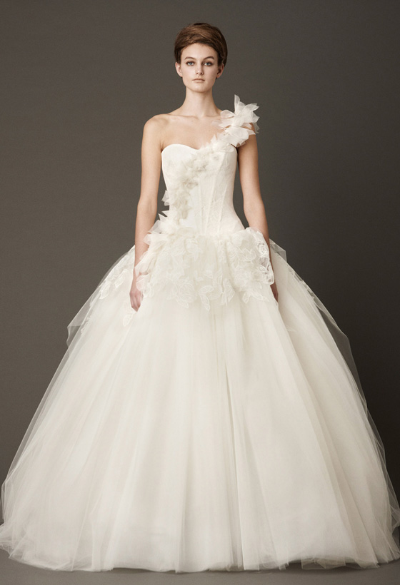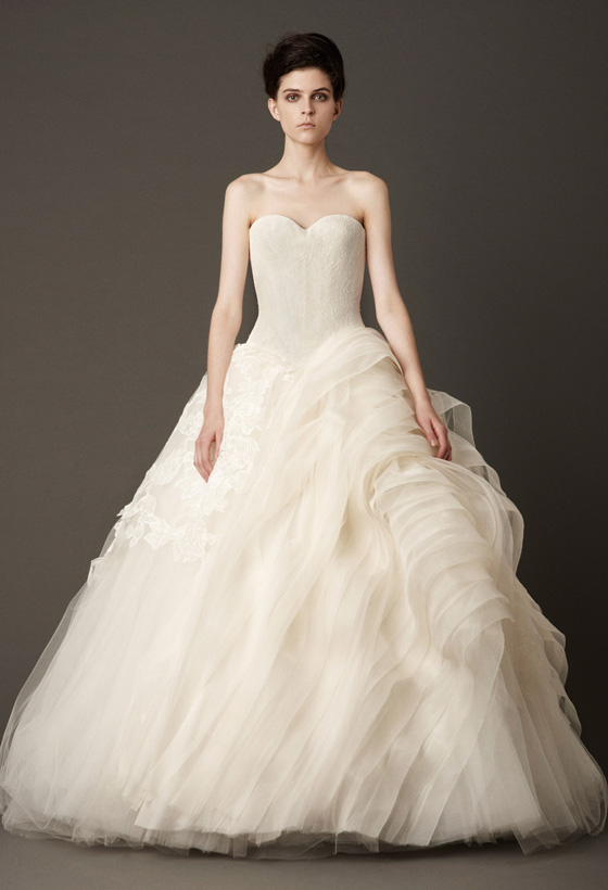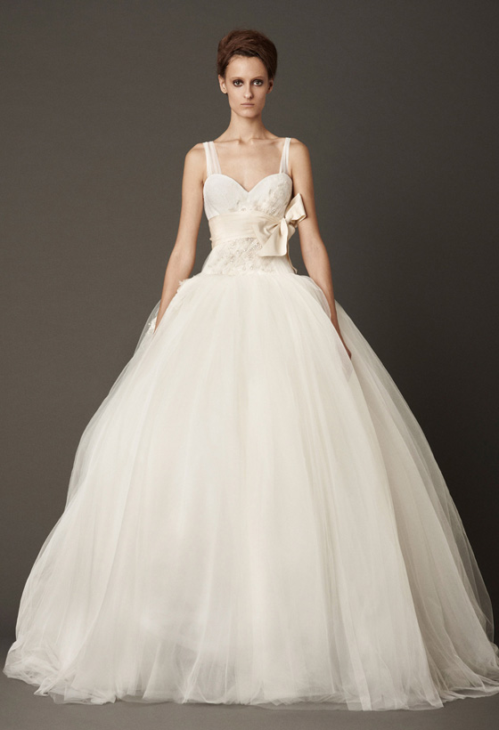 VERA WANGのウェディングドレスの中で、日本では最も有名なデザイン。胸元のハートカットにウエスト部分のVライン。たっぷりとしたチュールが人気の通称”バレリーナ”と呼ばれるVERA WANG代名詞的ウェディングドレスです。