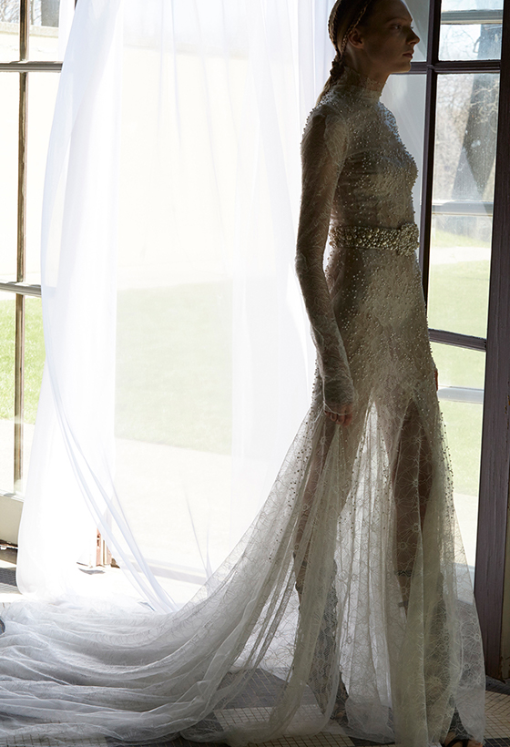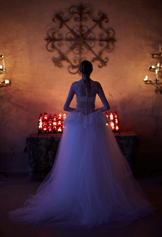 PANDRA(パンドラ)は、2015秋冬コレクションで発表されたデザイン。上品なソフトチュールが幾重にも重なり、チュールごとに異なる刺繍が施されています。首元まである繊細なレースはヴェラウォンならでは。